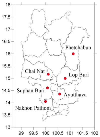 The central region is a vast plain in the center of the country. It is characterized by a large river basin consisting of mountains east and west, stretching parallel from the north. The trough is located on the northern highlands, down to the south at the edge of the track. Most of the area is lowland, divided into two parts: the eastern part is triangular, and the western or central regions are the rectangular area located on the bottom of the Gulf of Thailand. The central region has an area of approximately 92,795 km. The central region of Thailand is located from Longitude 98 E to 101 E and Latitude 13 N to 18 N, as shown in Figure 1. Most of the topography is lowlands, suitable for cultivation. The central population grows rice as the main occupation because the land contains infertile areas and river plains. The ground is sloped from the north and gradually slopes into the Gulf of Thailand in the south. Especially in the lower Chao Phraya River basin, it is higher than the sea level. The central region has an average temperature of 27–28 C, which is quite hot. The average precipitation of the region is about 1375 mm. Most of the area is in a confined zone, and it rains the most in September. Therefore, the central region is an important area for rice cultivation from the past to the present, especially in Nakhon Pathom, Suphan Buri, Chainat, Ayutthaya, Lopburi, and Phetchabun. Rice yield data were collected from the Agricultural Information Center, Office of Agricultural Economics, Ministry of Agriculture, and Cooperatives. The rice cultivar studied was Suphan Buri 1 rice from 2011 to 2018. The survey of annual rice yield per hectare was collected using the crop-cutting method using stratified two-stage sampling and systematic sampling. The district was designated as a population consisting of 490 villages with two levels of sampling units, or 9.70 percent of the total sample. The district was designated as a population consisting of two sampling units with 490 villages, representing 9.70% of the total number of samples, and three households were randomly selected. Each household randomly plots a sample and two survey points using the 30-step walk technique to frame a 1-square-meter survey and to calculate the statistics of the survey data using a simple mean calculation method.