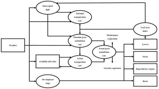 WOFOST is a mathematical model used in agriculture to study the behavior of biennial crops [30,31]. WOFOST is a daily plant growth simulation model. It is assumed that the system’s state can be quantified over time and that the changes in the system can be explained by mathematical equations [31]. In WOFOST, the dry matter is partitioned over the four parts of the plant according to fixed distribution factors, defined as a function of the development stage. Dry matter is first partitioned between shoots and roots, as shown in Equation (1). The growth rate of leaves, stems, and storage organs is simply the product of the dry matter growth rate of the shoots (Equation (2)) and the fraction allocated to these organs (Equation (3)). The model is divided into state, rate, and driving variables. State variables are quantities such as biomass or soil water content. The driving variables characterize the influence of external factors on the system but are not influenced by internal processes such as macro-meteorological variables, radiation, air temperature, and precipitation. The rate part can be calculated from the state and driving variables [31]. The general characteristics of plant growth are modeled based on physiological ecological processes. Important processes include phenological development, light-blocking, absorption of CO, evaporation, respiration, division of absorption to organs, and formation of dry matter, as shown in Figure 2. Potential growth and water restriction are modeled dynamically daily, considering the soil characteristics and limited water production. WOFOST is based on the SUCROS (Simple and Universal Crop growth Simulator) model [32,33]. SUCROS is a plant growth model that is influenced by environmental conditions and water constraints. The concept for calculation is the rate of CO (photosynthesis) absorption of canopy plants. Limited nutrient production is calculated according to the principles of the QUEFTS (QUantitative Evaluation of the Fertility of Tropical Soils) model [34]. The QUEFTS model provides yield predictions based on two factors: fertilizer inputs and soil parameters [34,35].