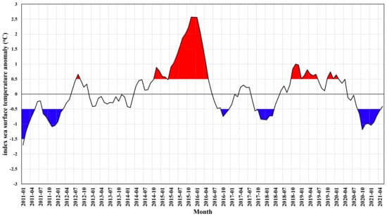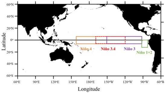 A Niño 3.4 region (5 N–5 S, 120 W–170 W) is the standard region used by the National Oceanic and Atmospheric Administration (NOAA) to identify El Niño (warm) and La Niño (cold) in the tropical Pacific Ocean as shown in Figure 3. The event is defined as having three months with a higher than +0.5 anomaly for warm events (El Niño) and with an anomaly at or below −0.5 for cold events (La Niña). The criteria are divided into additional weakness (with irregularities 0.5 to 0.9 SST), moderate (1.0 to 1.4), strong (1.5 to 1.9), and very severe events (≥2.0).