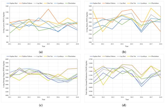 In this study, the simulation of rice yield was conducted using the WOFOST model, which models the growth and yield of a crop in the absence of injuries. The parameters of the WOFOST model were re-calibrated using the data in Thailand. The methodological framework of this study includes two procedures. The results of the WOFOST model are compared with the survey data from the Department of Agricultural Statistics, first, to verify that the model’s algorithms work properly and, second, to find the relationship between the Suphan rice yield and ENSO phenomena to determine the effect of rice yield. Model assessments were performed using historical data covering 2011 to 2018. The simulation results were compared with the observed data using statistical methods to determine whether WOFOST could simulate the growth of Suphan Buri 1 rice. Figure 4 shows the dry weight of living leaves (WLV), dry weight of living stems (WST), dry weight of living storage organs (WSO), and total above-ground production (dead and living plant organs) (TAGP) using the WOFOST model, as shown in Figure 4.