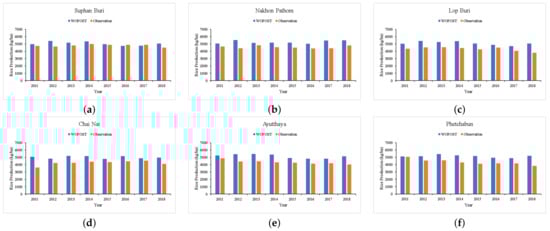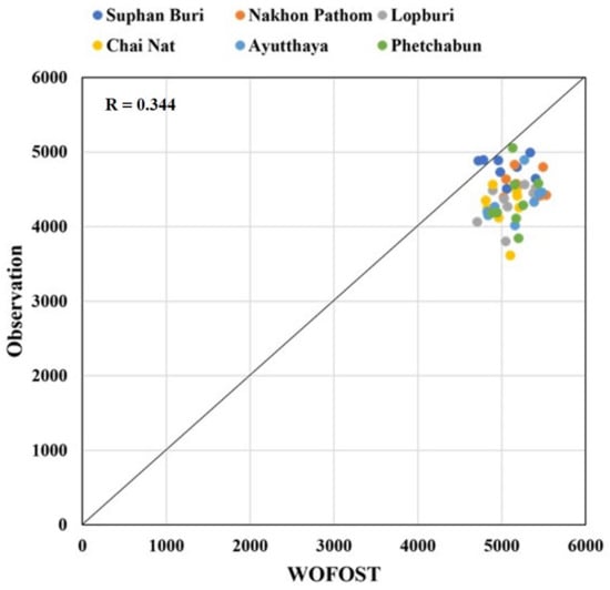 Figure 5 compares the simulated and observed rice yields of six provinces in central Thailand provinces from 2011 to 2018. Most rice yield simulations in the central region were overestimated (except Suphan Buri) because the model did not cover crop damage factors such as rice disease or insect damage. The Suphan Buri province had the closest simulation result because it used some measurement data on soil and crop management in Suphan Buri province. On the other hand, Phetchabun province had the greatest productivity difference due to its proximity to the northeastern region, where the soil characteristics were sandy. The soil in Phetchabun is medium to gravel soil and dense rubble. The topsoil is sandy loam, which is not suitable for planting. In Figure 6, the correlation coefficient for all six provinces is 0.344, which shows that the model has a low correlation. Due to some model’s input data, the data are not yet available. Therefore, soil data and plant growth data from nearby rice varieties were substituted, which may cause discrepancies in rice yields.