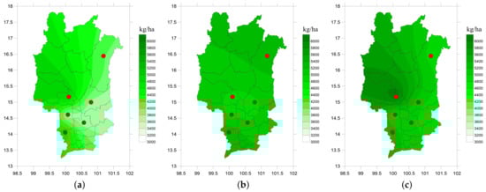 Forecasted results of rice yields in the central region in 2019 to 2021: (a) 2019, (b) 2020, and (c) 2021.