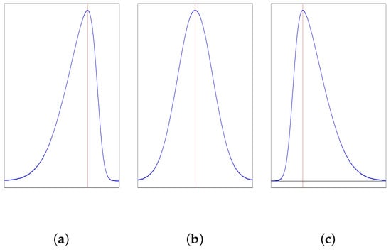 (a) Negative skewness, (b) symmetric, and (c) positive skewness.