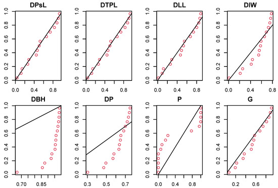 From Table 9, it is evident that, besides the DPsL distribution, the DTPL, G and DLL distributions also performed quite well, but it is clear that the DPsL distribution was the best among them, since it had the lowest K-S, AIC and BIC, with a higher p-value. In order to illustrate this claim, Figure 3 provides the probability–probability (P–P) plots, and Figure 4 displays the estimated cdfs of the fitted distributions.