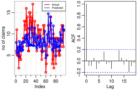 The predicted values of the number of claims dataset (left) and the ACF plot of the Pearson residuals (right).