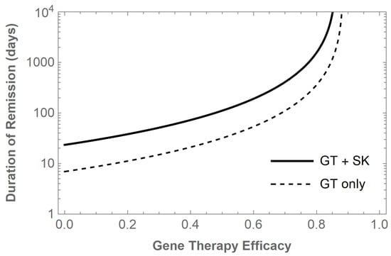 However, given current optimistic gene therapy efficacy rates of [], we may consider instead the potential benefits of using gene therapy in combination with LRAs and ART therapy to achieve an elongated remission time. We assume the reactivation rate r of cells from the latently infected reservoir is directly proportional to the steady-state size of the latent reservoir , i.e., , where is the natural activation rate of a latently infected cell. Using gene therapy alone at current efficacy levels of , we find that the duration of remission is 10.49 days. However, using an LRA activation rate of and ART removal rate of improves the duration of remission to 88.13 days. We summarize the added benefit of LRA+ART shock and kill treatment for other levels of gene therapy efficacy in Figure 1.