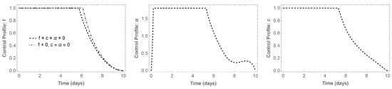 We follow the method presented in [] and utilize an iterative procedure to numerically solve the boundary value problem associated with the above optimality system. Using an initial guess for each of the three controls, we first solve the state system forward in time using a fourth-order Runge–Kutta procedure. Using the resulting state values and final time values, we next solve the adjoint system with transversality conditions backwards in time, again with a fourth-order Runge–Kutta scheme. The controls are then updated using a convex combination of the previous control values and the values resulting from the characterizations of each control. This iterative process then repeats until convergence, which occurs when the maximum relative error between each of the state variables, adjoint variables, and controls over successive iterations is less than a specified value .