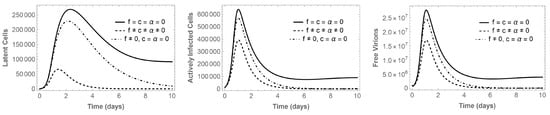 Impact of optimal treatment strategies on latent cell, actively infected cell, and free virion populations. Gene therapy (f) alone yields moderate reductions in all populations. Combination therapy including latency reversing agents (a) and ART therapy (c) provides significant reductions, especially in the latent reservoir.