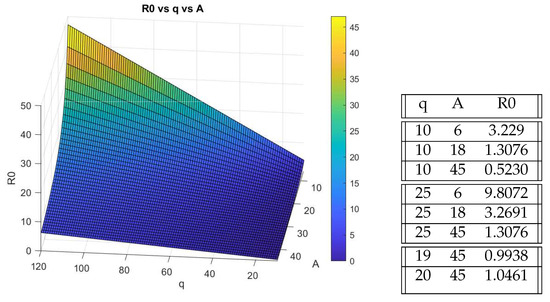 As the main goal of our research is to better understand how to mitigate viral spread based on the proposed model, we first want to see the effect filtration has on the basic reproduction number for differing quanta production rates q. In [18], the estimated values for q were 15–128 per hour for influenza, depending on how q was calculated, and 1–10 per hour for rhinovirus. Owing to the fact that data for quanta production is scarce and mostly related to only a few papers [10,15,18] that have discussed their values. We have chosen the ancestral strain to have for our model, and based on [25], we can approximate the delta variant as having when we are considering the best-case scenario. We provide a contour and table of important values below.