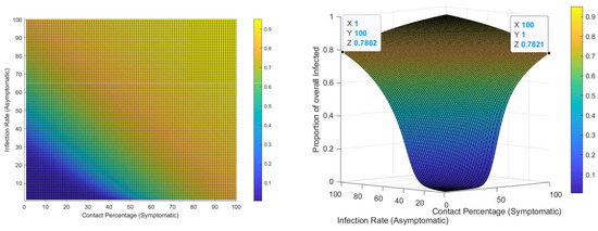 Figure 4 shows us that both infection rates for asymptomatics and the contact percentage for symptomatics affect the system in roughly the same way, and thus provides evidence to show how much of an effect stopping the spread of symptoms are, and that reducing the number of contacts that an infected individual has with susceptible individuals can play a large role in containing an outbreak.