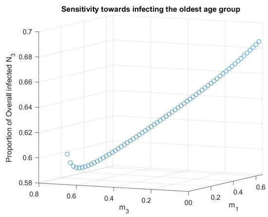 We achieved the results in Figure 5 and Figure 6 by allowing two different age group proportions to vary; we have that is the proportion of the youngest age group, and is the proportion of our oldest age group. We then analyze the overall sickness rate of the eldest age group by looking at the total number of infected in that group (Figure 5). This allows us to better understand how one might mitigate interactions between age groups to help contain the spread of COVID-19. We can see in (Figure 6) that the change in due to having differing amounts of age groups is negligible. However, we can see that our model does have sensitivity towards contacts, as evidenced by Figure 5. We can see that the proportion of the eldest group that gets sick increases almost linearly with the change in having more younger people. As the eldest group had the least contacts, this leads us to determine that contacts play more than a negligible role in determining overall sickness rates, though still overall, it is a minor change in terms of overall population sickness. This means that, according to our model, one of the best ways to combat the eldest age group sickness is by limiting their contact with younger groups of people that are more likely to interact with more people each day.