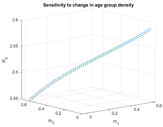 Oftentimes the most important question to ask is how an infection can propagate amongst the populace. This information paves the way for researchers to find ways to combat the spread itself, and is summed up in the basic reproduction number that we briefly touched on earlier. The from the normalized SIR model is a dimensionless value found when using values of at time . Thus, when we have an epidemic situation occurs, as more people are becoming infected, and when an epidemic is stemmed, as infections are being removed. We can reduce this equation to as we have assumed at the entire population is susceptible and hence . Thus, means an epidemic is stemmed, and means we have an epidemic situation. For our model, we have more than one age group and thus discovering is made trickier but is still just an extension of what was performed above. The main difference is that there are now several infected classes, and they may have different rates of contact between them, as well as infections. Our goal should then be to average the expected number of new infections over all of the infected states. The end result of these calculations will become a square matrix called the Next Generation Matrix (NGM). In an NGM H, the entry is equal to the between the completely susceptible group i, and the infected person in group j. Creating H is not extremely hard, and there are recipes to construct it [17]. However, the key is to break them down into smaller parts so that they can then be combined to create the full matrix.