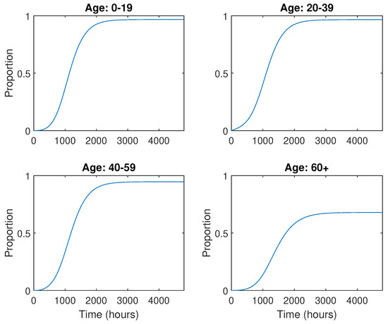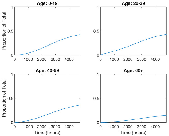 Now that we have the combined Gammaitoni–Nucci and SEIR models, we can combine this with the multi-age model to better see how each age group gets affected during a disease outbreak. We first notice that in the multi-age model Equations (21)–(23), we have the term