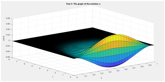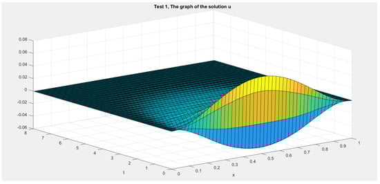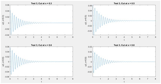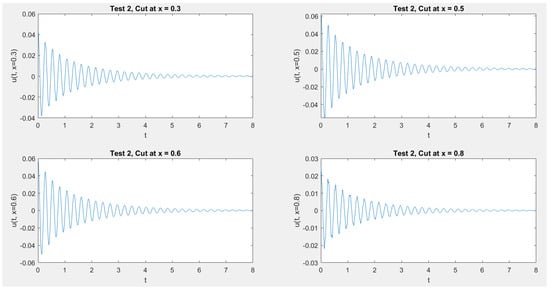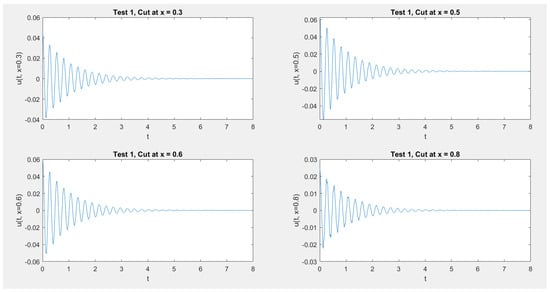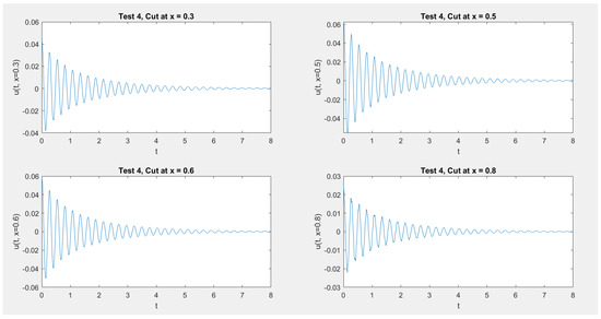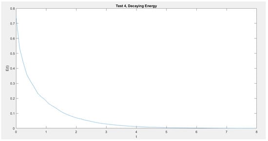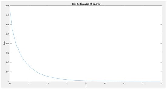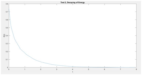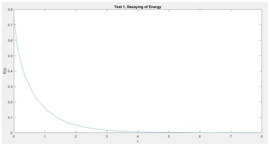 In Figure 1, Figure 2, Figure 3 and Figure 4 we show the cross section cuts of the approximate solution u at , , , and for Test 1, Test 2, Test 3, and Test 4, Respectively. In Figure 5, Figure 6, Figure 7 and Figure 8 we sketch the corresponding energy functional (14). Also, we sketch the decay behavior of the whole wave over the time interval in Figure 9, Figure 10, Figure 11 and Figure 12 for Test 1 to Test 4, Respectively.