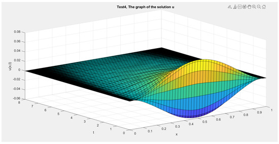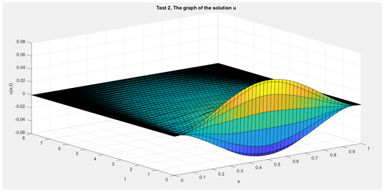 In this section, we perform some numerical experiments to illustrate the theoretical results in Theorems 1 and 2. For this purpose, we discretize the system (9) using a finite difference method (FDM) in both time and space with second-order in time and forth-order in space for the time-space domain . The spatial interval is divided into 50 subintervals, where the time interval is divided into subintervals with a time step .