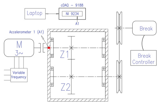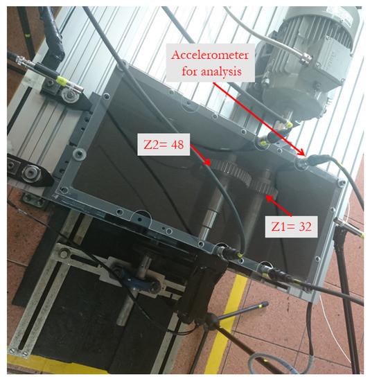 The spur gears in the gearbox are made from steel E410, with a center distance of 90 mm, the ratio Z1/Z2 of the teeth number is 32/48, the module is 2.25 and the pressure angle is 20. The vibration signals were collected with all four accelerometers, but this work only analyses the vibration signals collected from the accelerometer (A1) placed over Z1 in a vertical manner, as shown in Figure 5. The accelerometer (A1) provides the most informative vibration signal because it is close to the motor [74].