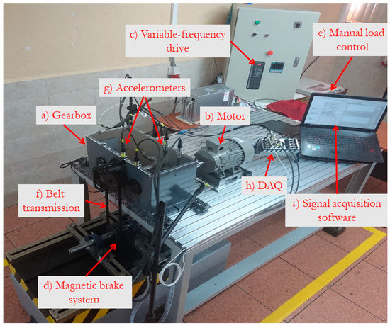 The real test bed available at the Universidad Politécnica Salesiana is shown in Figure 4, where realistic conditions of load and speed can be configured. The test bed is composed by a one stage gearbox (a) with spur gears, an induction motor (b) Siemens 1LA7 096-6YA60 2Hp 1200 rpm under variable speed controlled by a variable-frequency driver (c), and a magnetic brake system (d) for manual load control (e) via belt transmission (f). The four accelerometers (g) are IMI Sensor 603C01, 100 mV/g, placed in a vertical manner. The data acquisition cards (h) are National Instrument NI 9234 and cDAQ-9188, including anti-aliasing filtering with a sample frequency of 50 KS/s and, finally, the laptop with signal acquisition software (i) developed in Labview and Matlab.