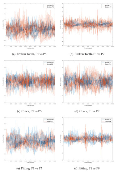 Three failure modes are considered, namely pitting, crack and broken tooth, each one configured on the gear Z1, as detailed in Table 1. For pitting, the severity level is related to the number of holes, their diameter and depth. For cracks, the severity level is related to the depth, width and length of the crack throughout the tooth. The broken tooth was implemented as a percentage of transverse breakage on the tooth. Vibrations signals were collected for nine severity levels for each failure mode, where P1 labels the Normal (N) or healthy state, and P2 to P9 label each fault severity level. An example of the vibration signals in the time domain of each failure mode in normal conditions, severity levels P2 and P9, is presented in Figure 6. These figures show the change of the vibration amplitude, but this change is not monotonic regarding the severity level. Details about these failure modes are given in Section 2.2.