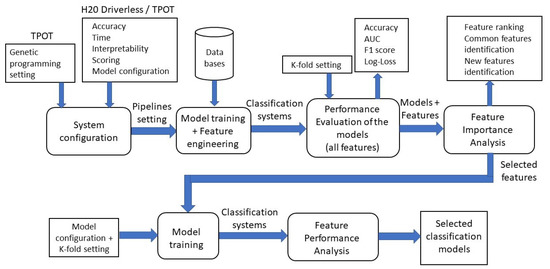 The goal is the comparison of the informative capability between the original statistical features, through the performance evaluation of the ML classifiers proposed by the AutoML systems. The experimental framework uses the software tools H2O Driverless AI which is equipped with evolutionary algorithms to perform feature engineering and selection, and TPOT, which also uses an evolutionary search to build tree-based ML pipelines. Both tools are relatively simple and straightforward to use, offering basic and intuitive configurations for generating different types of pipelines using state-of-the-art techniques and implementations.