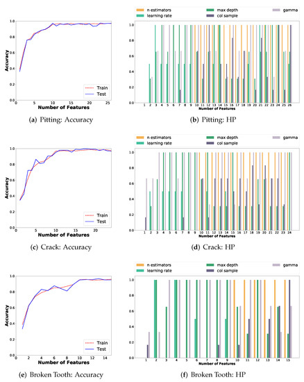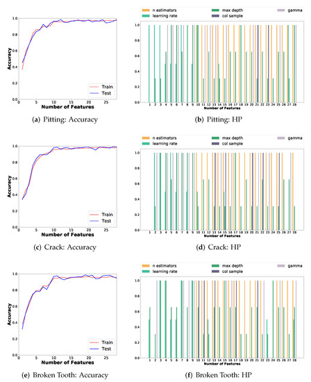 While feature engineering did not lead to substantial improvements in classification accuracy, however, the AutoML feature importance estimation and feature selection process are also evaluated. Table 3 presents a summary of the feature importance scores assigned by DAI to each of the features used in this study, which are given in the range of , when setting . Features that are assigned a value below are not used by the ML pipeline found in a particular problem, and those features with such a value in all three pipelines are omitted from the table. Notice that the number of features that meet these criteria for each problem is well below the total number of available features: 26 for pitting, 15 for Broken Tooth and 24 for crack.
