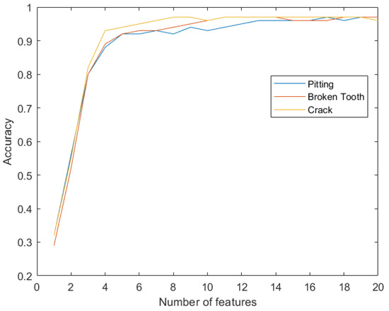 In [12], the identification of five different gear crack levels is performed by using features obtained from Wavelet Packet Decomposition (WPD). The first set of features is composed by 620 statistical features calculated from the wavelet coefficients at different levels, which are then reduced to seven significant principal components. KNN is used as a classifier and compared to other statistical models such as linear discriminant analysis, quadratic discriminant analysis, classification and regression trees, and naive Bayes classifier. Another approach to crack fault level identification is discussed in [13] by considering 25 features extracted from the time and frequency domains. A two-stage feature selection and weighting technique via Euclidean distance evaluation is proposed to select sensitive features and to weigh the selected features according to their sensitivity to each fault level. The Weighted K-Nearest Neighbor (WKNN) classifier is adopted to identify three gear crack levels under different loads and motor speeds.
