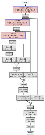 As a result, we propose the architecture shown in Figure 2. In the figure, k refers to the kernels size, s to the stride, d to the dilations and C to the output channels of each layer (the same for all dimensions). This network has only ∼370 K trainable parameters, which is a tiny number compared to standard architectures. For comparison, the 3D version of SqueezeNet [36,39], which was designed to be a small network, has 2.15 M parameters).