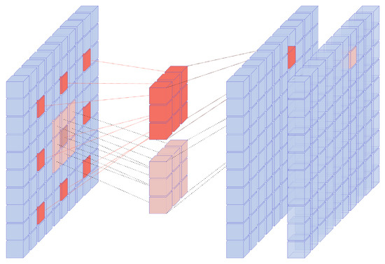 where represents the value of the voxel at position of the output 3D image, C labels the channel (or feature map) of the output image, , and are natural numbers called strides and , and are naturals called dilations (their meaning is explained in Section 2.2), , and are the height, width and depth of the 3D convolutional kernels applied to the input image x, with channels, is a bias parameter for each feature map C and w are the weight parameters.