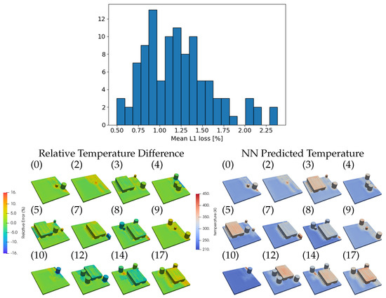 The mean value of the relative error, however, does not fully represent the (in-)accuracy of the NN results, as large but very localized error values can be smeared out when averaging over the large number of voxels in a system. More insightful is thus to compare FEM and NN solutions directly in their 3D representations. In Figure 4, a representative collection of 3D solutions and 3D maps of the relative temperature differences is shown, picking one sample from most of the bins in the histogram discussed above, as indicated in the figure. For the majority of systems the NN solution reproduces the FEM solution reasonably well. The main discrepancies appear in relation with the small chip and on the surfaces of the components and the PCB.