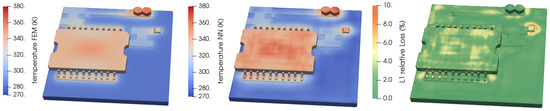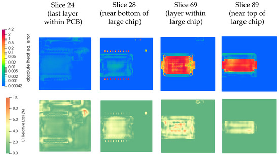 Further details are shown in Figure 5, where a section of a selected system is presented. There, on the surface of the PCB and also around the small chip, the error is somewhat larger. Furthermore, in the inner part of the large chip some localized discrepancies can be seen, which are a reminiscence of the checkerboard artefacts of FCNs. However, these are clearly localized and do not affect the overall temperature of the chip.