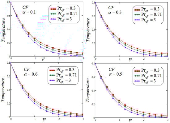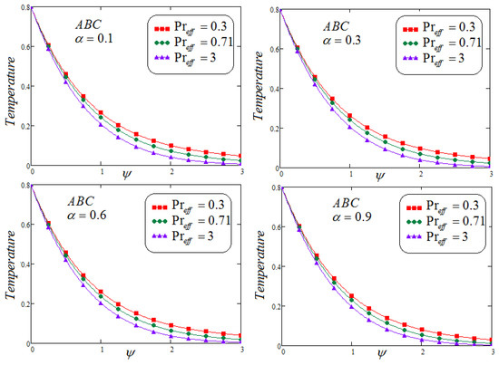 Figure 1 and Figure 2 represent the influence of via CF and ABC with , on fluid temperature. It is indicated that advances in Prandtl number reduce the temperature profile of the moving fluid for distinct values of fractional parameter. The boundary layer of temperature profile gets thicker due to the fact that there is a small rate of thermal diffusion and the resultant temperature profile decreases.