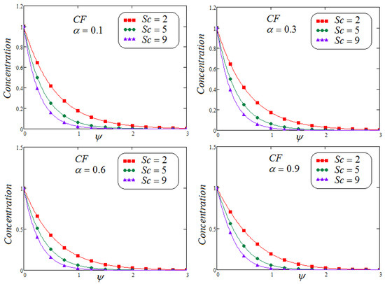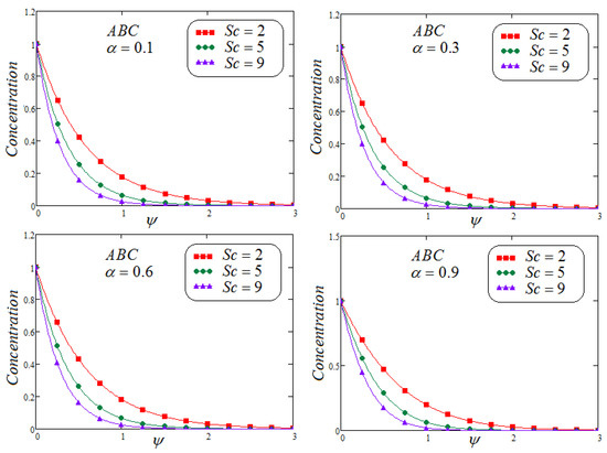 Concerning Figure 3 and Figure 4, the action of on concentration profile along with the applications of CF and ABC fractional operators are analyzed for various values of fractional parameter as . It is remarked that the concentration profile of the fluid will decrease as increases. Physically, the reduction in the boundary layer of concentration happened to correspond to enhancing the Schmidt number.