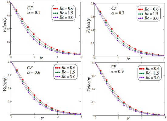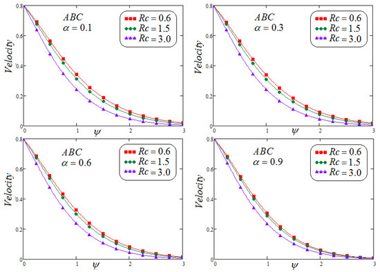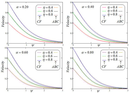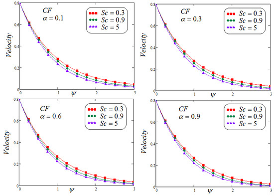 Concerning Figure 5 and Figure 6, the action of on the velocity profile along with the applications of CF and ABC fractional operators are analyzed for various values of fractional parameter as . It is remarked that the velocity of the fluid flow will decrease as increases. Physically, the Schmidt number is mathematically defined as the ratio of momentum to mass diffusivity. It is a fact that the layer of momentum diffusivity of the fluid is more viscous; as a result velocity decreases. Schmidt number signified concentration and velocity in free convection flow regimes of fluids concern relative effectiveness momentum.