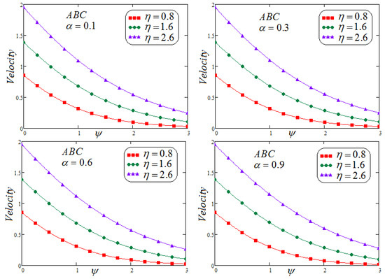 Figure 9 and Figure 10 portray the behavior of on fluid velocity via CF and ABC time fractional operators for distinct values of and take time as fixed for both operators. It is realized that the velocity decreases corresponding to the increase in the value of . Further, it is pointed out that the momentum profiles describe the same behaviour for both the fractional derivative operators.