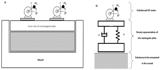 Figure 1. Illustration in mechanical engineering of a non-ideal vibrating system: (a) Front view of a simplified representation of a compacting machine with its physical model (b).