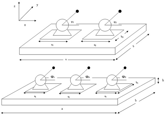 The system was composed of a rectangular plate (with dimensions: length a, width b, and thickness h), where edges were simply supported. Here, two or three DC electrical machines carrying unbalanced masses on their shafts were fixed and regularly spaced on the plate. It was supposed that the electrical machines rest and act on a precise areas on the plate. In addition, the rectangular plate was responsible for bending and shearing displacements, but here, only transversal displacement was taken in account.