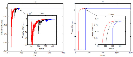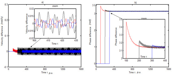 Figure 4. Representation of velocity difference (a) and phase difference (b) between the two DC electrical machines as a function of dimensionless time computed with α 1 = α 2 = 0.201 when the main frequency of the structure is ω 11 = 0.873 . The second DC electrical machine starts with a delay: τ 2 = 100 (red); τ 2 = 200 (black); τ 2 = 300 (blue), while the first electrical machine is already on. The DC electrical machines are already fixed on the rectangular plate before switching on the first electrical machine and are regularly spaced on it. They rotate in the same direction when they are switched on.
