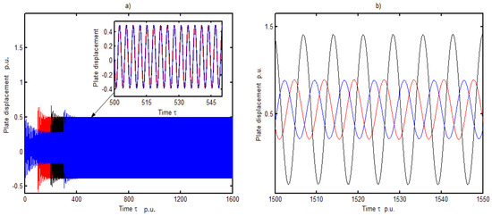 Figure 5. Representation of plate amplitude vibration for two values of the main frequency of the plate ω 11 = 2.73 (a) and ω 11 = 0.873 (b) in view of their comparison. The first DC electrical machine is already on when the second starts with a delay: τ 2 = 100 (red); τ 2 = 200 (black); τ 2 = 300 (blue). They are computed when α 1 = α 2 = 0.201 . In addition, electrical machines are already fixed on the rectangular plate before switching on the first electrical machine and are regularly spaced on it. They rotate in the same direction when they are switched on.