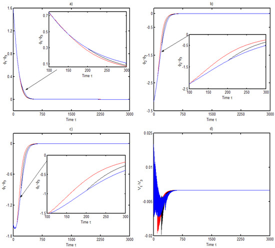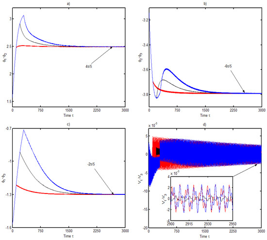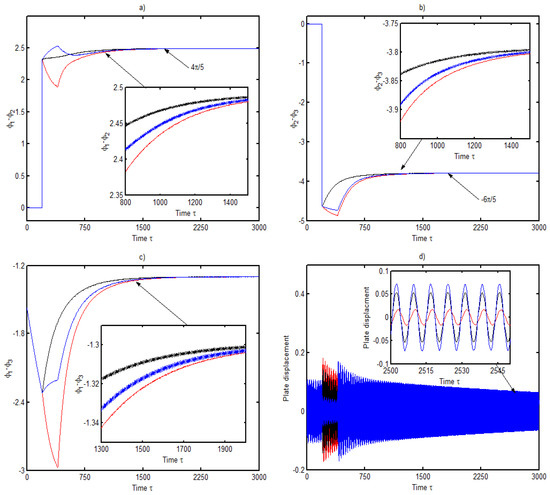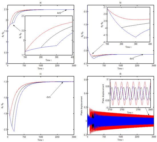 Figure 6. Representation of the phase difference (ac) between the three electrical machines and velocity difference between the DC1 and DC3 (d) for a main frequency of the structure of ω 11 = 0.873 . The first and the second DC electrical machines start at the same moment τ 1 = τ 2 = 0 , while the third starts with a delay: τ 3 = 100 (red); τ 3 = 200 (black); τ 3 = 300 (blue). They are computed with α 1 = α 3 = 0.056 and α 2 = 0.088 . In addition, electrical machines are already fixed on the rectangular plate before switching on the first electrical machine and are regularly spaced on it. They rotate in the same direction when they are switched on.