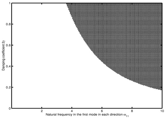 Figure 10. Stability chart of the system around the fixed point ( Y 110 , Z 0 , φ 10 , V 10 , φ 20 , V 20 ) obtained by respecting the Routh–Hurwitz criterion and conditions presented in Equation (7). It shows the region depending on the natural frequency of the rectangular plate and the damping coefficient, where we could obtain stability of the system around the obtained fixed point. It is computed for α 1 = α 2 = 0.201 , when the electrical machines are rotating in the same direction and is regularly spaced on the rectangular plate.