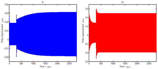 Figure 11. Representation of the plate displacement for two couples of value of the stability chart in view of their comparison. The first value (i) is obtained in the stability zone in black for ( ω 11 = 8.1906 , 2 γ = 0.49 ), while the second one (ii) is plotted in the instability domain for ( ω 11 = 2.7302 , 2 γ = 0.000984870 ).