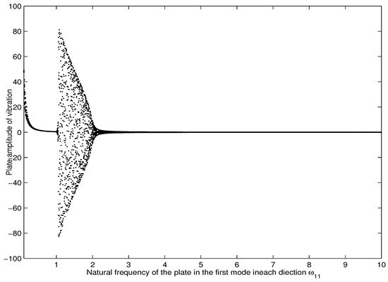 The analysis of this result lead us to conclude that for low values of the natural frequency of the plate, even with strong damping, the system is unstable. While with high value of the natural frequency of the plate, the system is stable even with low damping. This could be confirmed by plotting, in Figure 12, the bifurcation diagram of the system around the obtained fixed point. One can observe that, for high values of the natural frequency of the plate, in the first mode in each direction, the system is more stable. This is in accordance with the domain in black, shown in Figure 10, which is more important, but it increases the natural frequency of the plate. We also observe the predominance of high amplitude for small values of the natural frequency, which is confirmed in the white region of the stability chart.