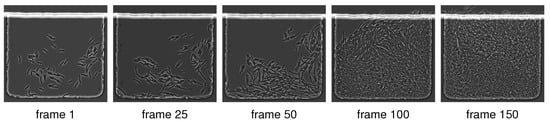 Typical microscopy image sequence. We show five frames out of a total of 150 frames of an image sequence showing the dynamics of E. coli in a microfluidic device [] (real laboratory image data). These cells are are about 1 m in diameter and on average 3 m in length, and they divide about every 30 min. The original images exported from the microscope are 0.11 m/pixel. We report results for these real datasets in Section 4.