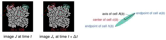 Cell Motion. Let J, denote two successive images (i.e., frames). Denote , as the associated sets of cells. Superpose temporarily the images J and so that they then have the same center pixel. Any cell , which does not divide in the interframe , becomes a cell in image . The “motion vector” of cell b from frame J to is then defined by . If the cell b does divide between J and , denote as the last position reached by cell b at the time of cell division, and define similarly the motion . In our experimental recordings of real bacterial colonies with interframe duration 6 min, there is a fixed number such that for all cells for all pairs J, . In particular, we observed that, for real image sequences, pixels is an adequate choice. Consequently, we select pixels for all simulated image sequences of BENCH6. For BENCH1, we select pixels, again based on a comparison with real experimental recordings. Overall, the meta-parameter w is assumed to be a fixed number and to be known, since is an observable upper bound for the cell motion norm for a particular image sequence of a lab experiment.
