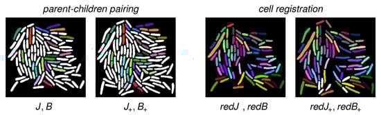 We also verify the performance of our approach on real datasets of E. coli bacteria. These bacteria are about 1 m in diameter and on average 3 m in length, and they divide about every 30 min. The original images exported from the microscope are 0.11 m/pixel. The microscopy experimental data were obtained using JS006 [] (BW25113 araC lacI) E. coli strains containing a plasmid constitutively expressing yellow or cyan fluorescent protein (sfyfp or sfcfp) for identification. The plasmid also contains an ampicillin resistance gene and p15A origin. These cells were grown overnight in LB medium with 100 g/mL ampicillin for 18 h. These cultures were diluted in the morning into 1/1000 into 50 mL fresh LB with 100 g/mL ampicillin and grown for 3 h until they reached an OD600 of about 0.3. The cells were then concentrated by centrifuging 30 mL of culture at 2000× g for 5 min and then resuspending in 10 mL of fresh LB. The concentrated culture was loaded into a hallway microfluidic device prewarmed and flushed with 0.1% (v/v) Tween-20 []. In the microfluidic device, the cells were provided with continuous fresh LB with 100 g/mL ampicillin and 0.075% (v/v) Tween-20. The microfluidic device was placed onto an 60× oil objective and imaged every 6 min at phase contrast, YFP, and CFP filter settings using an inverted fluorescence microscope. We show a representative dataset in Figure 1.
