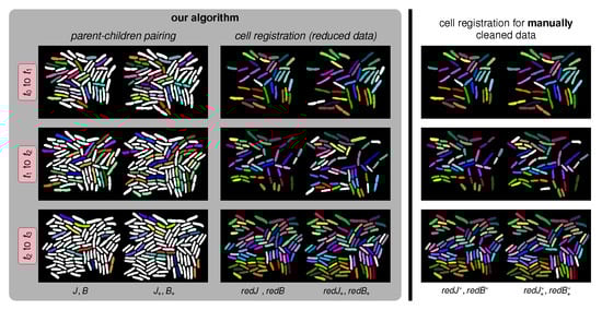 As we have mentioned in the abstract, we obtain a tracking accuracy that ranges from 90% to 100%, respectively. Overall, our method is competitive with existing approaches: For example, Ref. [] reports a tracking accuracy of up to 97% for data that are similar to ours, while Ref. [] reports a tracking accuracy (spatial, temporal, and cell division detection) at the order of 95% (between about 93% and 98%, respectively). The second group also reports results for their prior approach [], with an accuracy at the order of 90% (ranging from about 87% to 92%, respectively). Accuracies reported in [] range from about 92% to 97%, respectively. This work also includes a comparison to one of their earlier approaches [] with an accuracy of up to 85% and 89% if the datasets are pre-aligned. We note that the data considered in [,,,] are quite different from ours. Refs. [,,,,] consider the data from the cell tracking challenge [,] to evaluate the performance of their methods. As in the previously mentioned work, these data are again quite different from ours. To evaluate the performance of the methodology, the so-called acyclic oriented graph matching measure [] is considered. We refer to the webpage of the cell tracking challenge for details on the evaluation metrics (see http://celltrackingchallenge.net/evaluation-methodology, accessed on 15 December 2021). Based on these, the reported tracking scores are between 0.873 and 0.902 [], 0.901 and 1.00 [], 0.950 and 0.987 [], 0.788 and 0.982 [] and 0.765 and 0.915 [] depending on the considered data set, respectively.