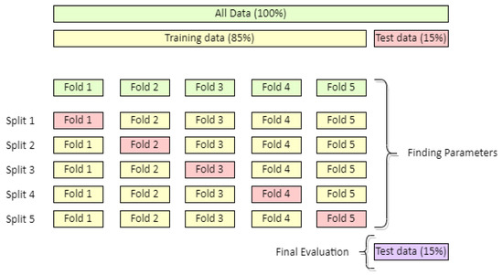 Scheme of the K-fold cross-validation for the proposed ML models, inspired from [47,48].