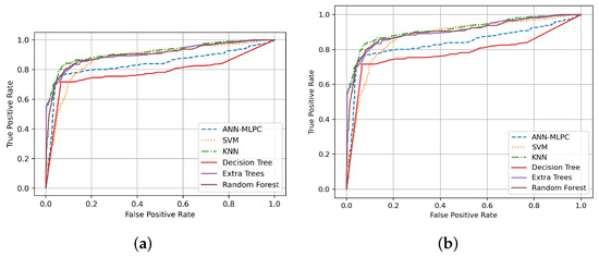 Table 8 shows the average results of K-fold cross-validation corresponding to each ML model. In this study, we use K = 5 folds, and this assisted in validating all the scoring parameters of each ML model. The Accuracy, F1 score, Precision, Recall, and ROC-AUC were the metrics that could be achieved through this cross-validation; the ML model that had the best overall performance was the KNN, with the best scoring parameters, followed by RF in second place. Later, we found the Extra Trees model, in fourth place is MLP-NN, in fifth place are the Decision Trees, and last but not least is the SVM classifier.