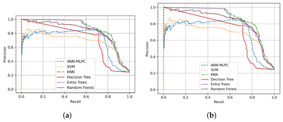 Figure 4 shows that the PR curves of the Raspberry Pi 4 and PC are similar; the KNN classifier has a better PR curve over all classifiers in both cases, having a larger area under the curve covered within the graph, making it one of the best classifiers, followed by the Extra Trees classifier.
