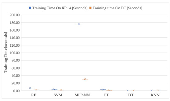 The average time of each of the proposed classifiers to be used within this problem was obtained both on PC and Raspberry Pi 4. Figure 5 shows the average time of ten training runs of each model with their respective characteristics, both on the computer and on the SoC, to analyze the cost–benefit of each of the proposed classifiers to be used within this problem. Due to factors of processing power operations, it turns out to be faster than the Raspberry Pi 4, with the Decision Trees model being the fastest, followed closely by the KNN, and further behind the Extra Trees, all with a training time of less than a second, then the SVM, before reaching 2 s, the RF classifier, and finally, the MLP-NN being the slowest of all with a time greater than 30 s. The training on the Raspberry Pi 4 takes two to five times longer due to the embedded system’s processing limitations, with times of 0.02 s in Decision Trees, 0.1 s in KNN models, 2.81 s in Extra Trees, 3.12 s in SVM, 6.89 s in RF models, and finally 175.85 s in RF models.
