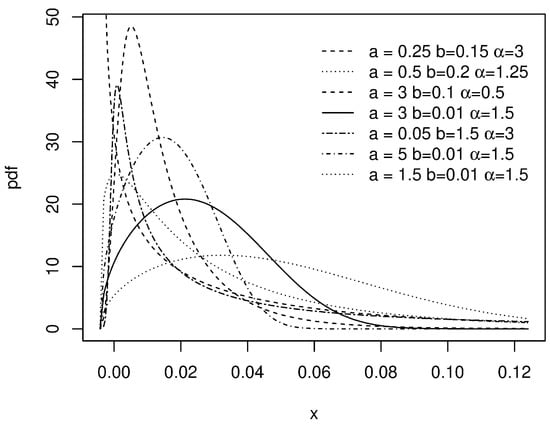 respectively, where a and are shape parameters, and b and are scale parameters. We have for . Thus, the cdf has been derived from the following formula: , . By taking , we remark that ; the NHLx distribution is reduced to the EXL distribution with . The asymptotic properties of the pdf depend on the values of mainly; with the use of standard asymptotic techniques, we establish that